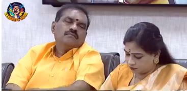 నీటి పారుదల శాఖ మంత్రి నిమ్మల రామానాయుడు మీటింగ్లో కునుకు తీస్తూ కనిపించారు. చంద్రబాబు సుదీర్ఘంగా ప్రసంగిస్తుండటంతో, అలసట వల్లనో లేదా సబ్జెక్ట్ బోర్ కొట్టడం వల్లనో గానీ, ఆయన గాఢ నిద్రలోకి జారుకున్న వీడియోలు వైరల్ అవుతున్నాయి. “బాబు మాట.. నిమ్మల నిద్ర” అంటూ సోషల్ మీడియాలో ట్రోల్స్ వస్తున్నాయి.